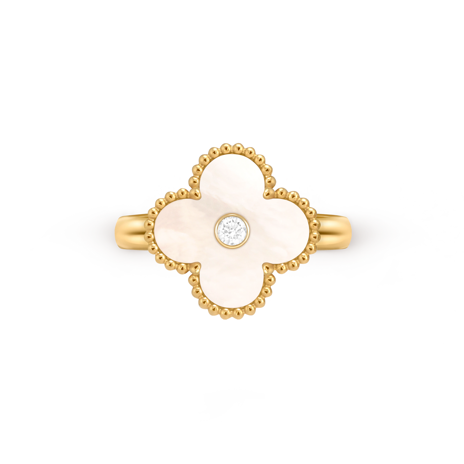 This Van Cleef & Arpels classic four-leaf clover ring is made of carefully selected copper and treated with meticulous gold plating, presenting a warm and elegant luster. The fusion design of white mother-of-pearl and diamond endows each wear with a unique temperament and charm. Whether for daily wear or special occasions, this piece of jewelry can showcase your taste and style. The classic four-leaf clover design carries the meanings of luck and elegance, making it an ideal choice for enhancing the overall temperament.