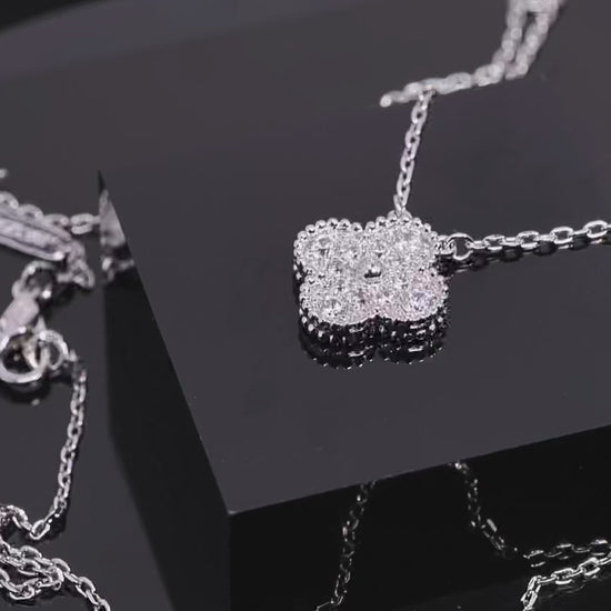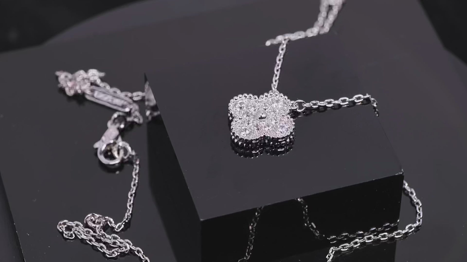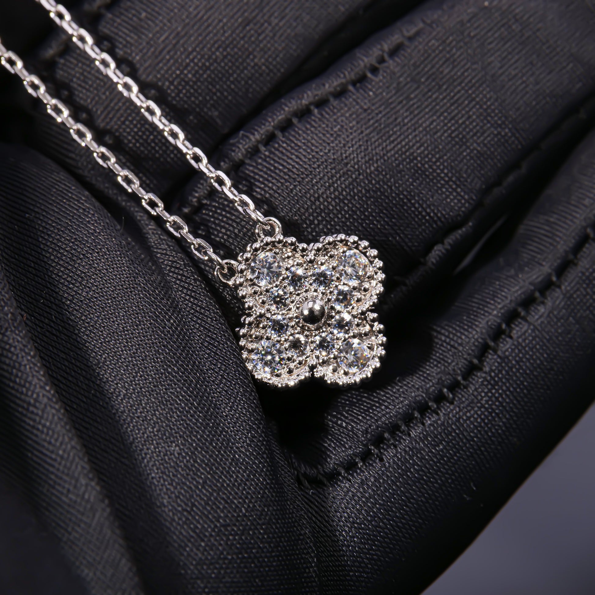 This four-leaf clover necklace combines classic design with exquisite craftsmanship. Crafted from copper and featuring a platinum electroplating process, it presents an elegant metallic luster. Elaborately inlaid diamonds adorn the four-leaf clover pendant, adding a dazzling luster and a sense of luxury. The four-leaf clover symbolizes luck and beauty, making it an ideal gift choice. The necklace is exquisitely designed and comfortable to wear, making it suitable for daily wear or special occasions。