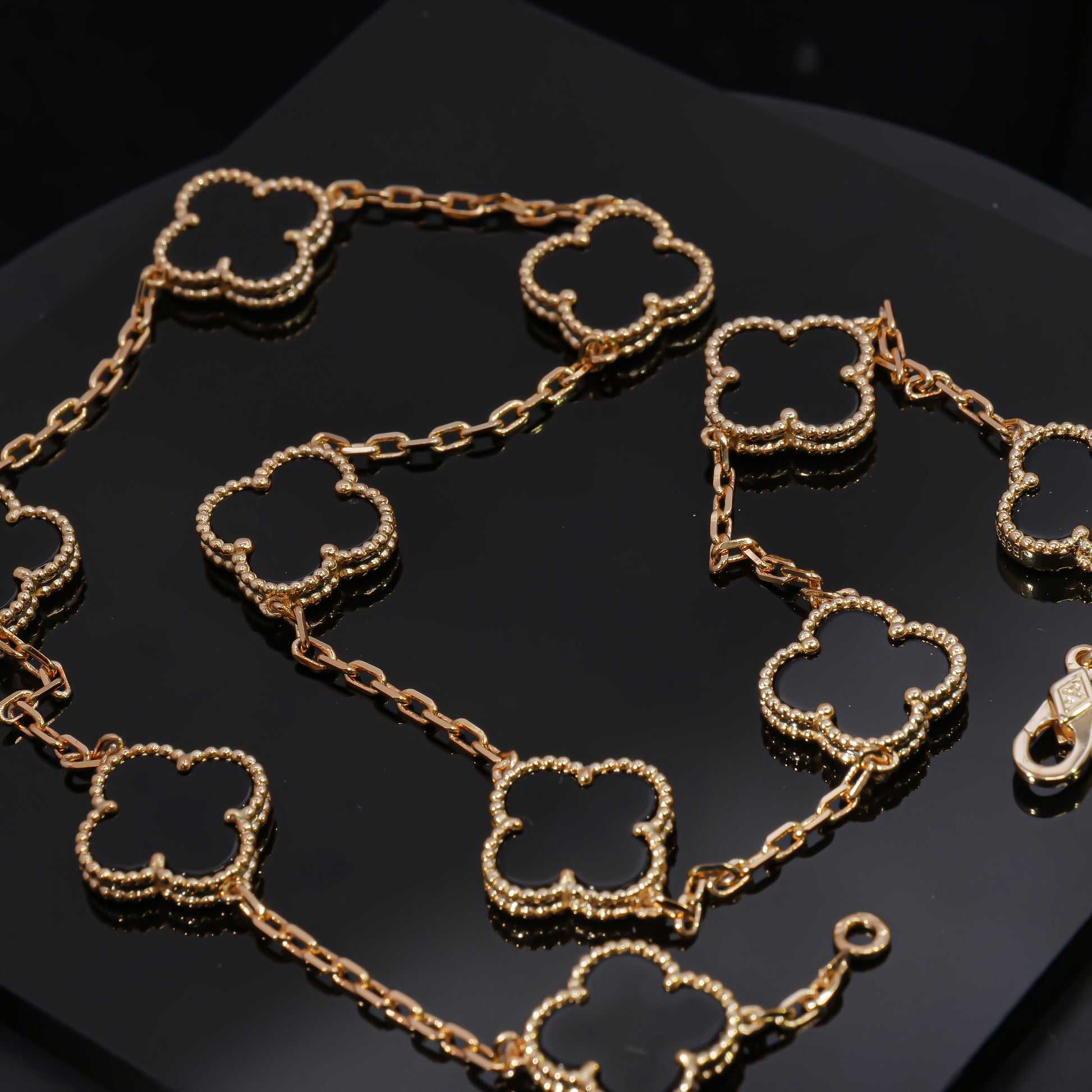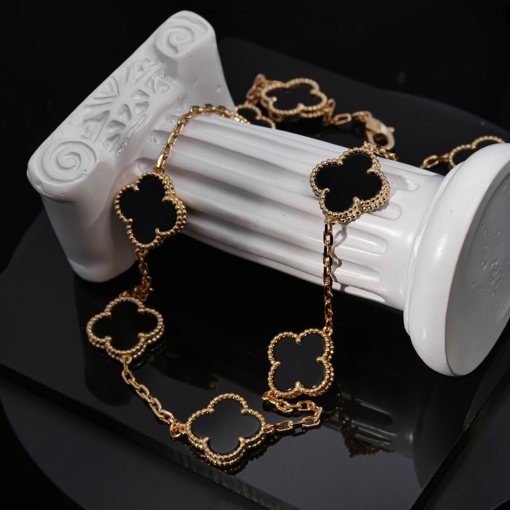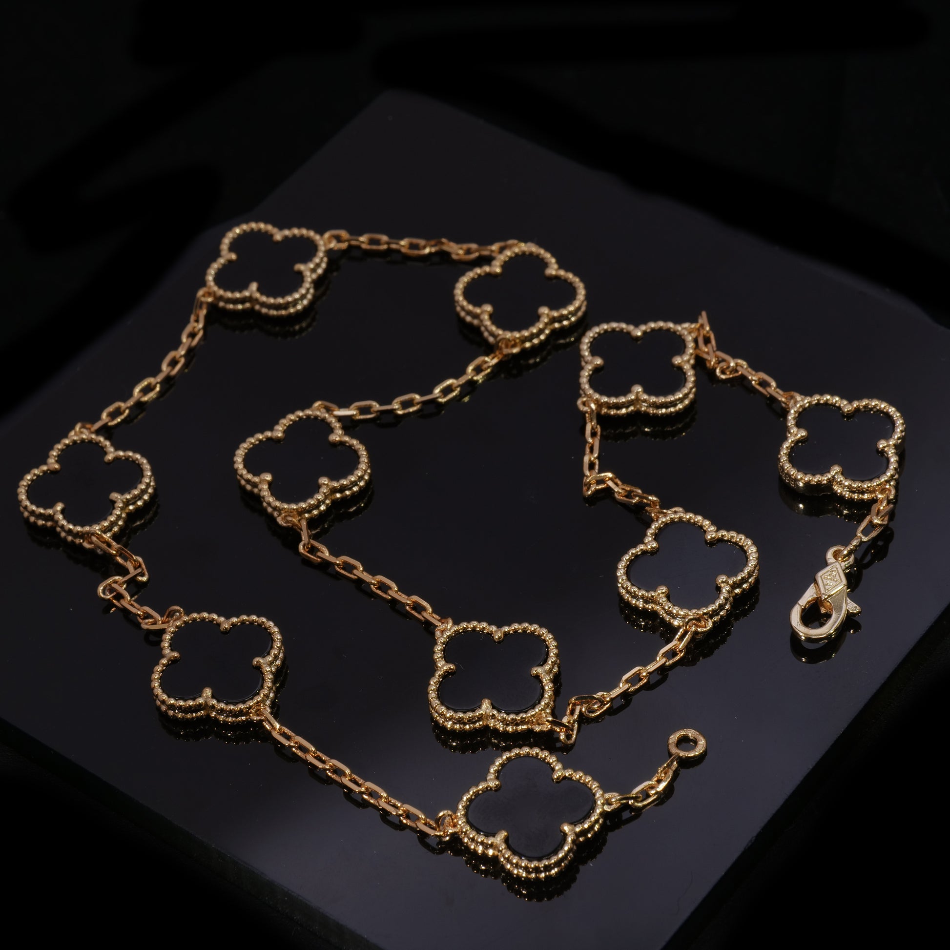 our-leaf clover black mother-of-pearl gold necklace, meticulously crafted from high-quality copper chain material. Ten carefully selected black mother-of-pearl beads are dotted among them, exuding a warm luster and harmoniously matching the golden tones. The four-leaf clover pendant is made of mother-of-pearl material, symbolizing good luck and beauty. Fine craftsmanship ensures that every detail showcases professional quality, making it suitable for daily wear or special occasions, and an ideal choice to highlight one's temperament