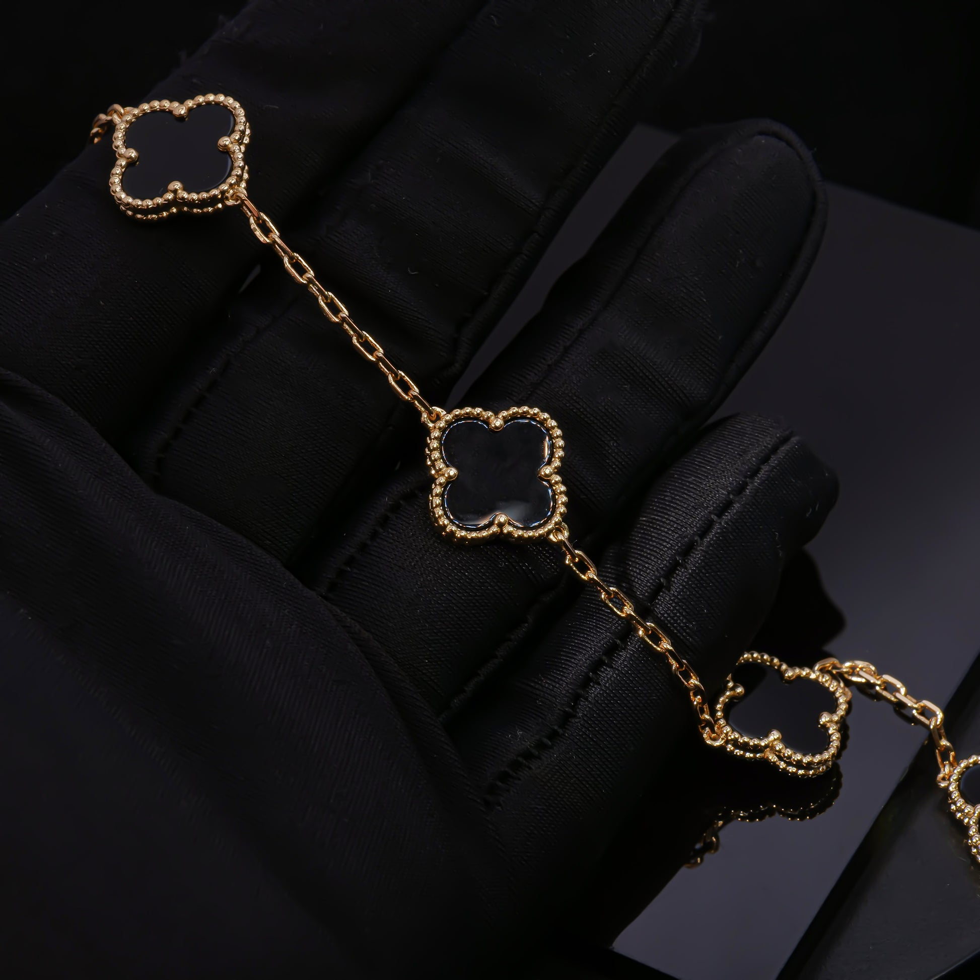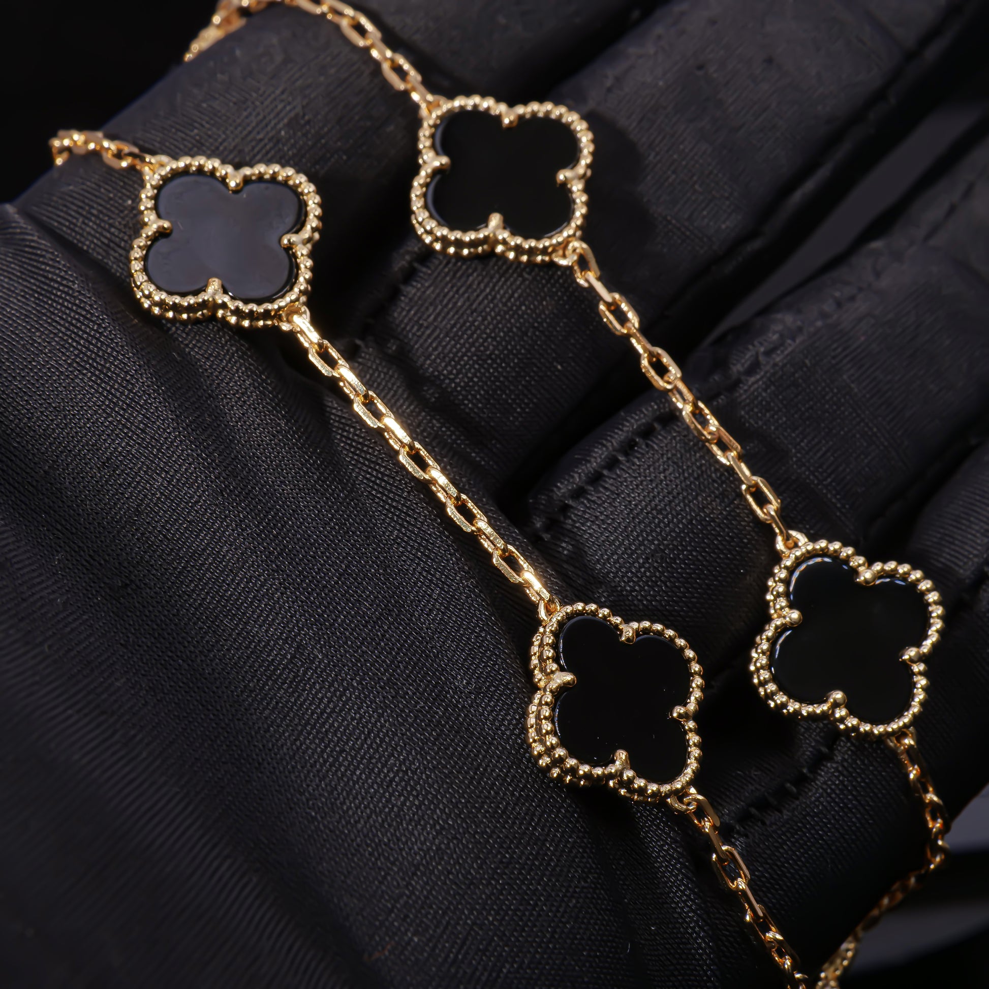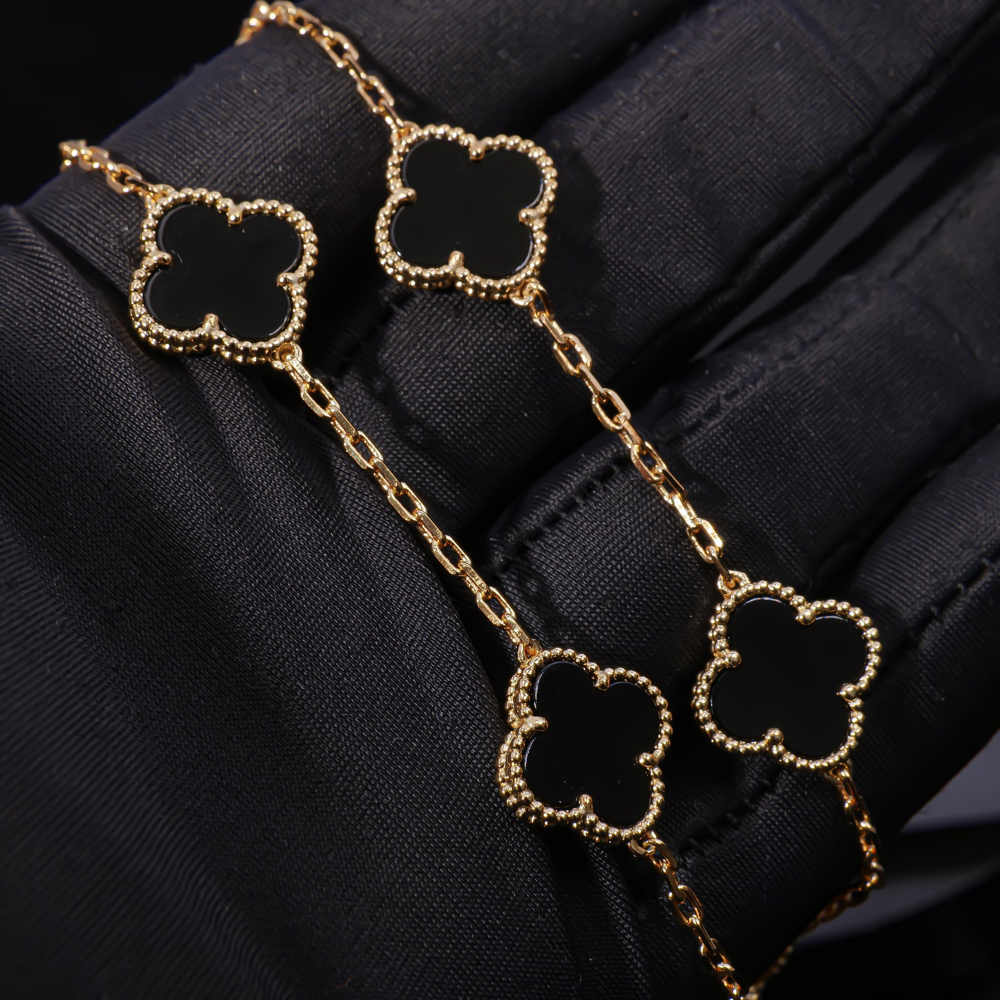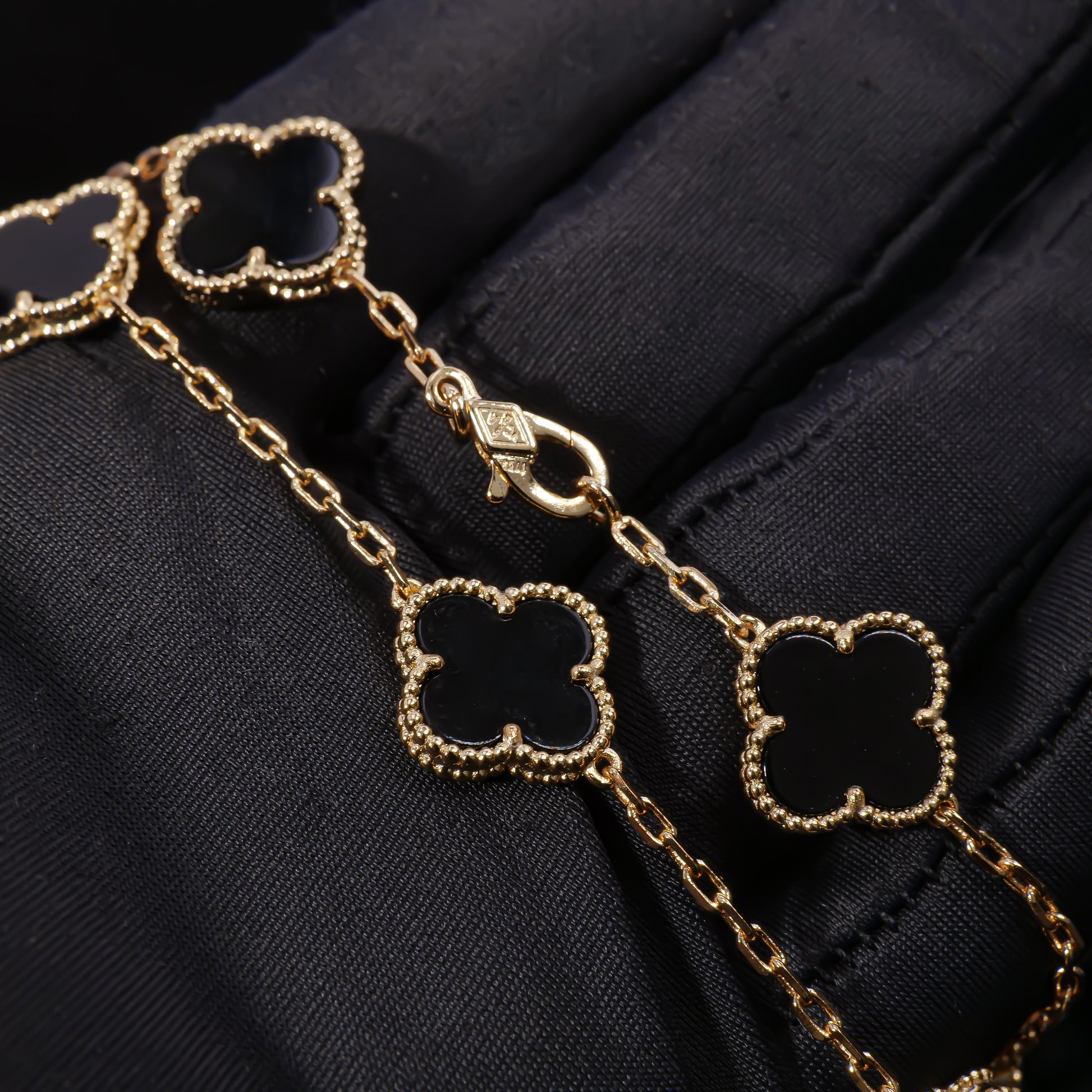 our-leaf clover black mother-of-pearl gold necklace, meticulously crafted from high-quality copper chain material. Ten carefully selected black mother-of-pearl beads are dotted among them, exuding a warm luster and harmoniously matching the golden tones. The four-leaf clover pendant is made of mother-of-pearl material, symbolizing good luck and beauty. Fine craftsmanship ensures that every detail showcases professional quality, making it suitable for daily wear or special occasions, and an ideal choice to highlight one's temperament