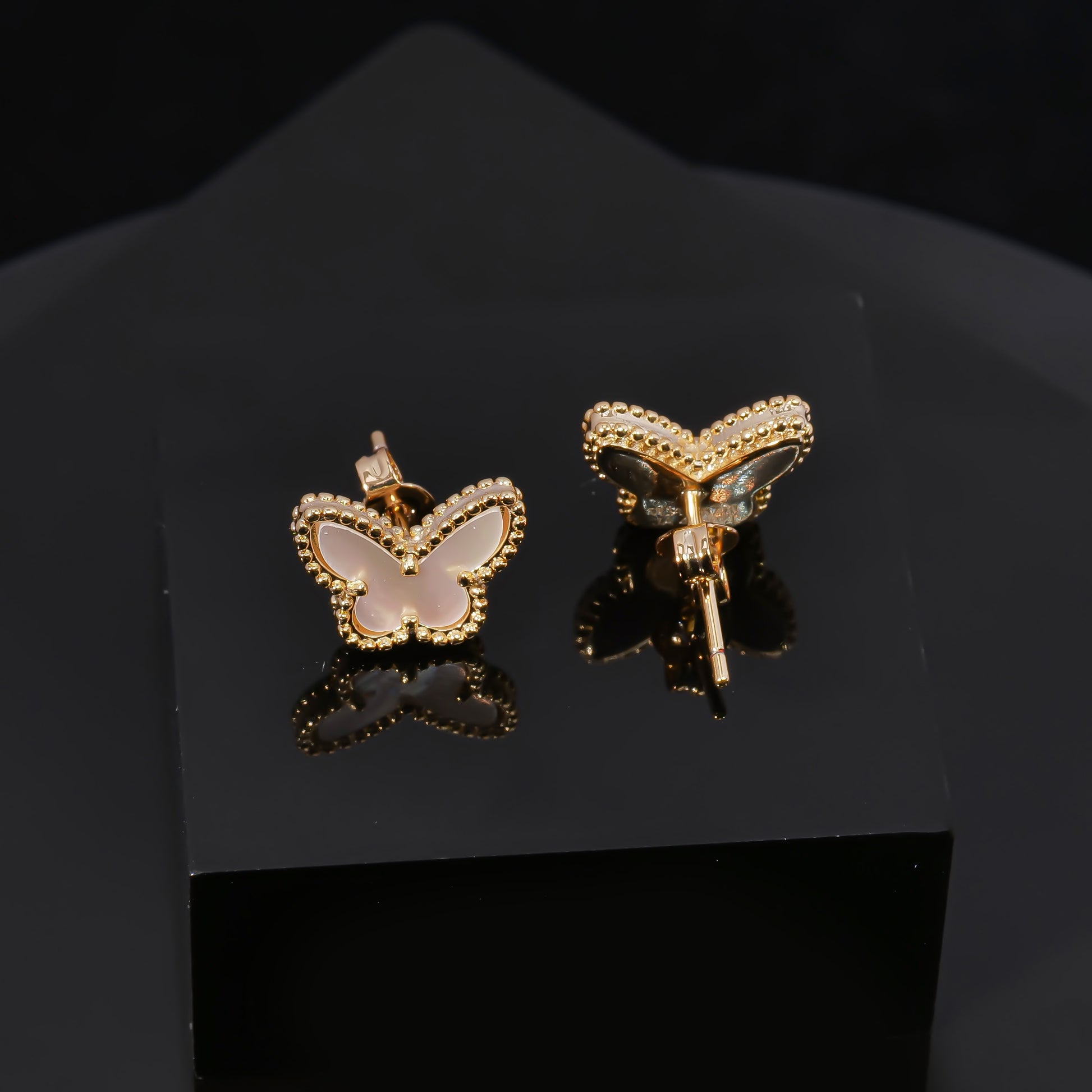 Elegant butterfly-shaped stud earrings, crafted from carefully selected mother-of-pearl material, exude a warm and lustrous sheen. The copper inlay is exquisitely crafted, adding a touch of refined texture. The butterfly design symbolizes freedom and elegance, making it suitable for daily wear or special occasions. The natural texture of the mother-of-pearl is unique, and each pair is a one-of-a-kind work of art. Light and comfortable, it showcases your taste and temperament.