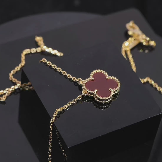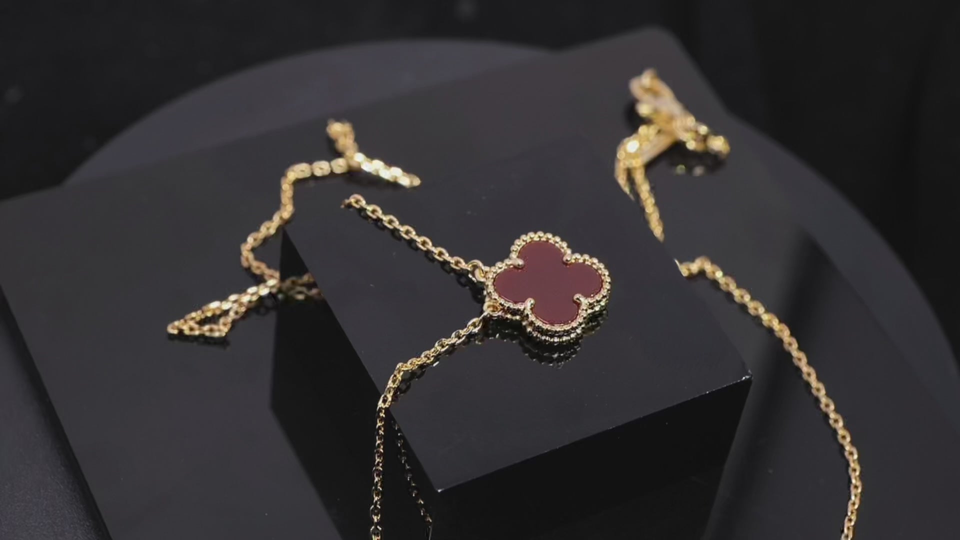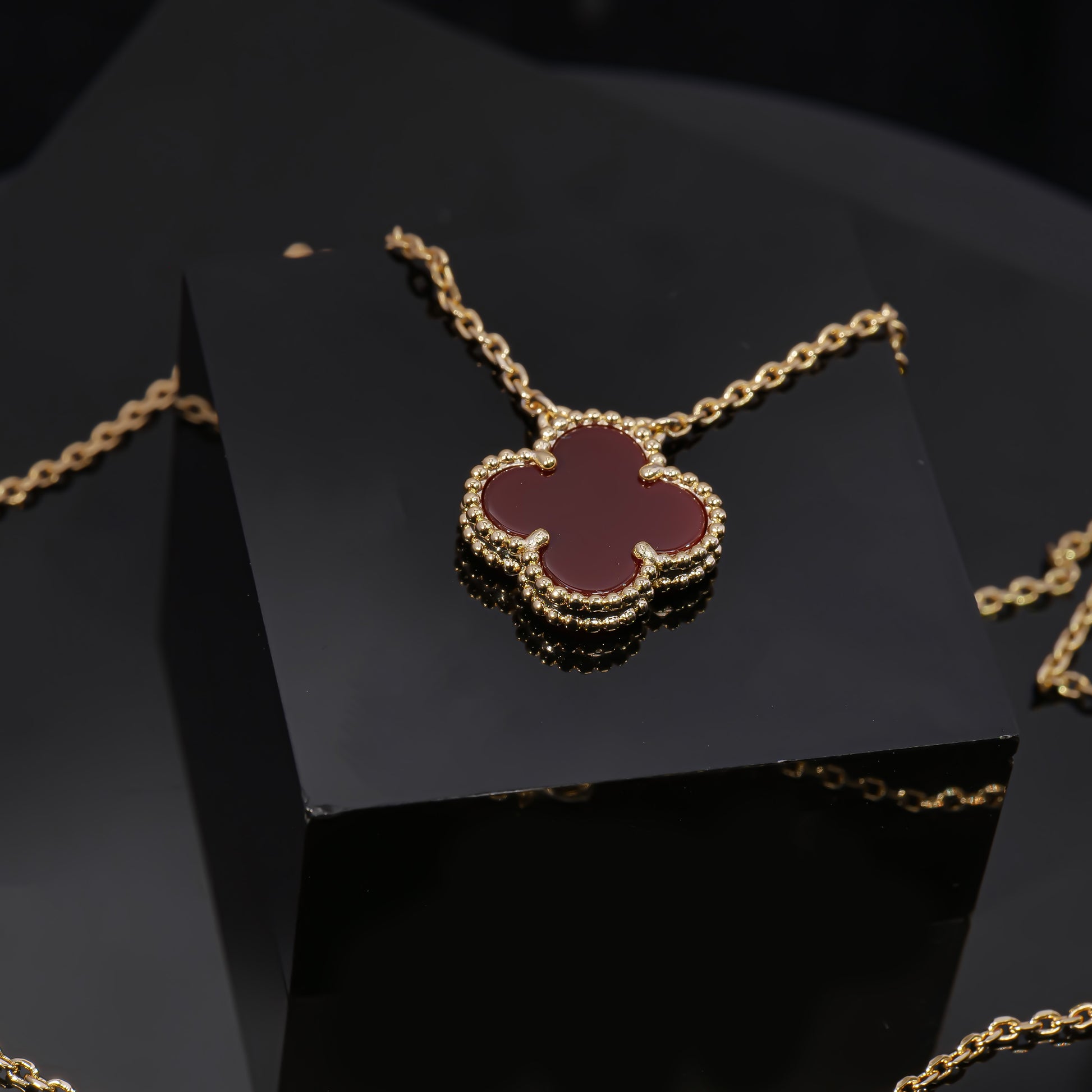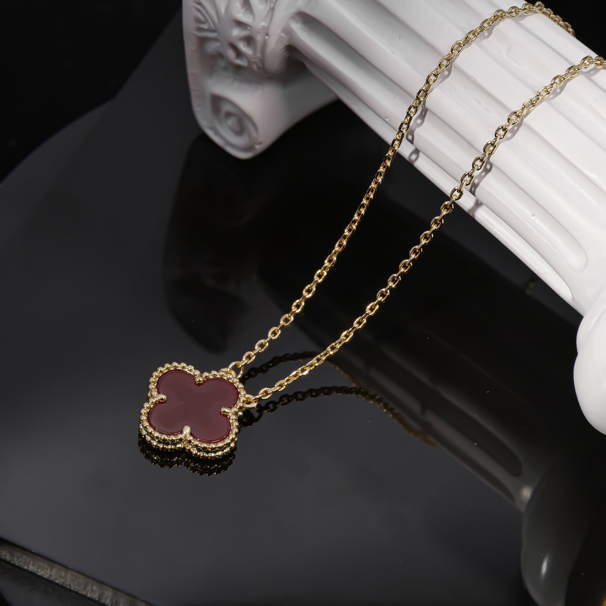 This VCA red agate pendant necklace is made of carefully selected copper material and combined with rose gold craftsmanship, presenting a noble and elegant temperament. Red agate is renowned for its deep color and mysterious charm, and has been regarded as a lucky stone since ancient times. The elaborately designed pendant has a simple yet luxurious shape, perfectly highlighting feminine charm. Whether worn daily or on special occasions, it can showcase one's taste. This piece of jewelry is an ideal choice for women who pursue a high quality of life.