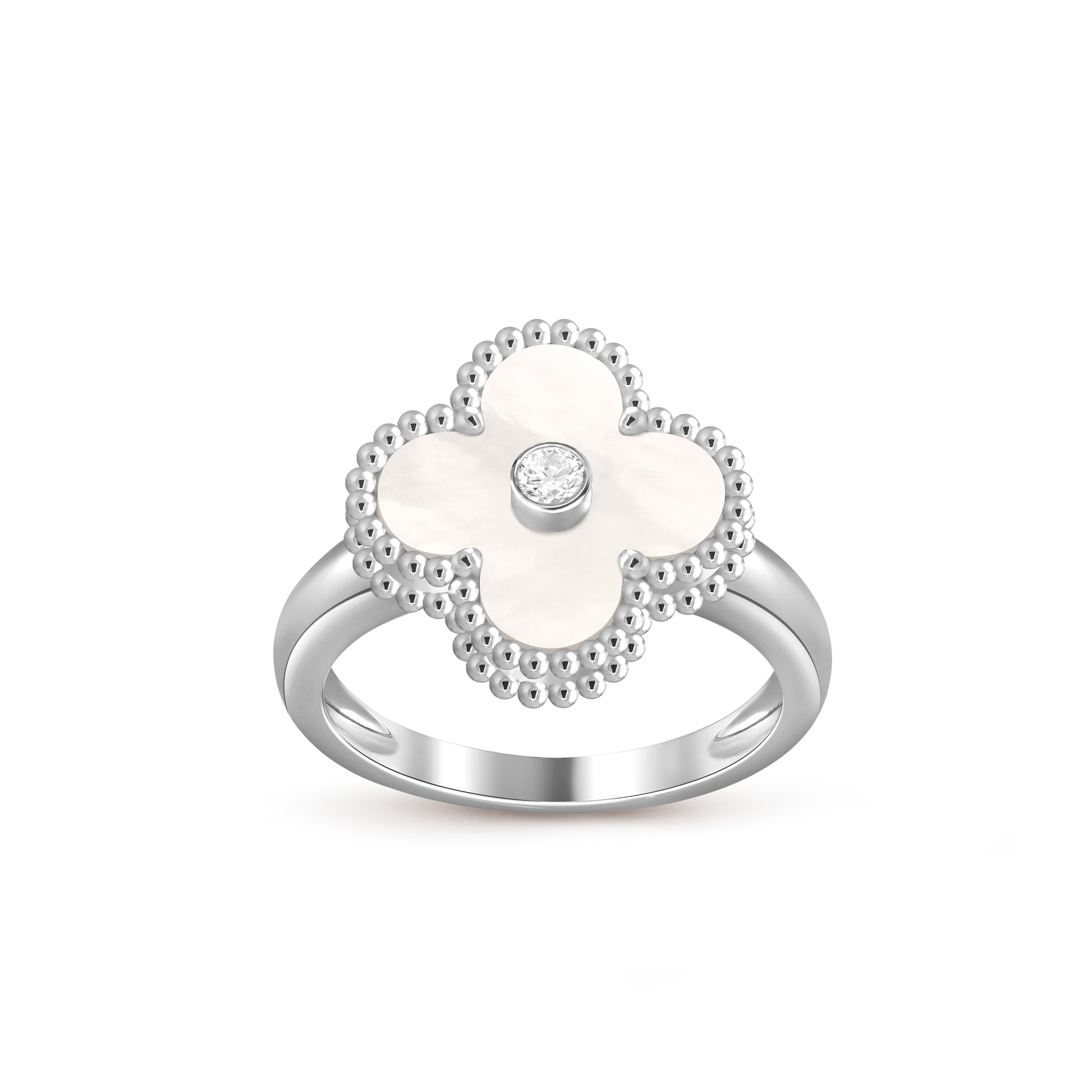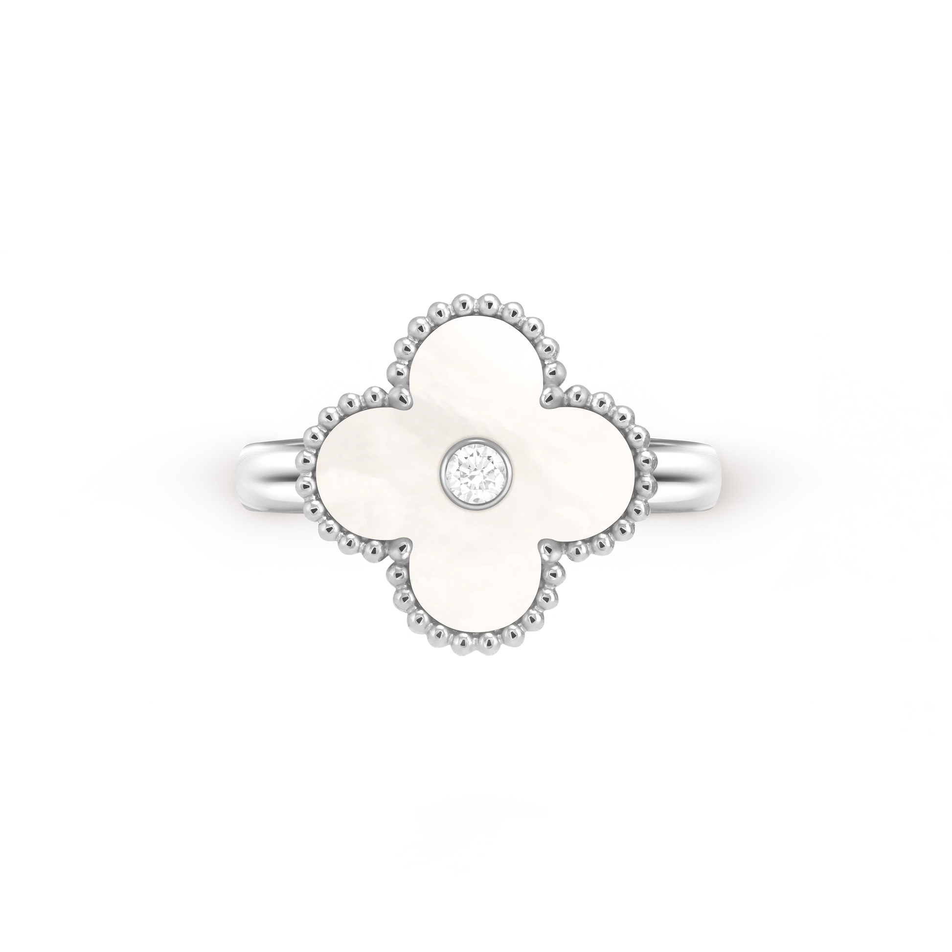 # VCA White Gold Mother-of-Pearl Ring with Diamond Vintage Alhambra Elevate your jewelry collection with this exquisite Vintage Alhambra-inspired ring, crafted from premium copper with white gold plating for lasting brilliance. The iconic four-leaf clover motif, adorned with lustrous mother-of-pearl and sparkling diamonds, embodies timeless elegance and refined sophistication. Its versatile design transitions seamlessly from everyday wear to formal occasions, making it an indispensable addition to any discerning jewelry wardrobe. The gold-plated finish ensures durability while maintaining that coveted luxury aesthetic. A statement piece that celebrates both classic beauty and contemporary style.
